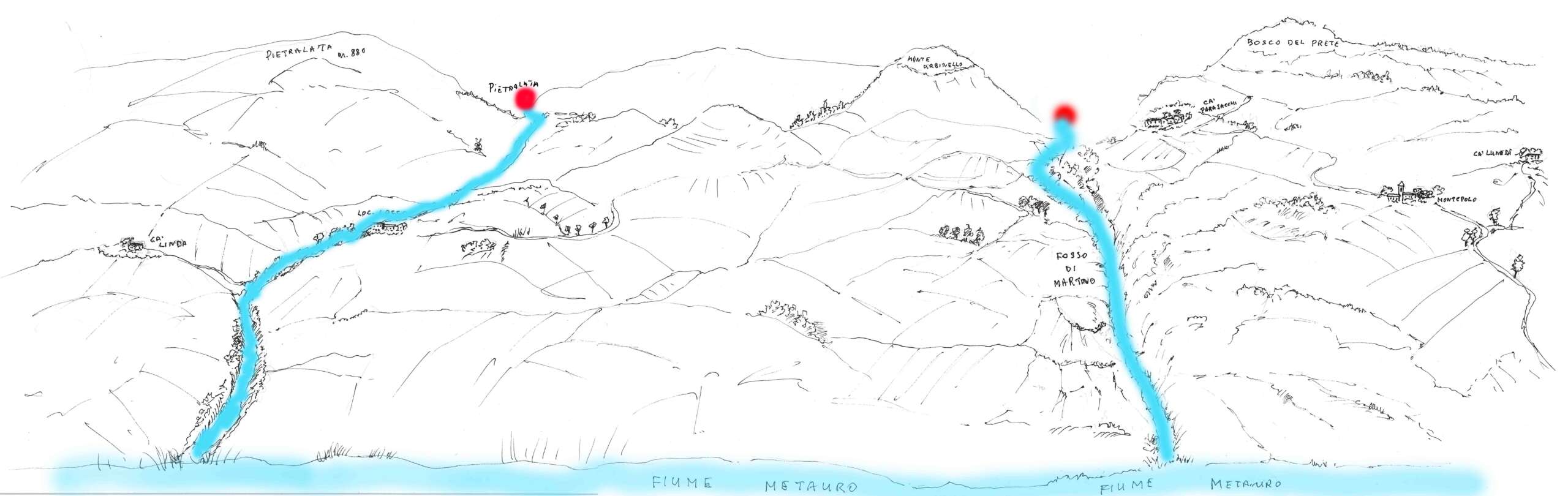 Al centro troviamo il fiume Metauro che si incanala a San Marino di Urbino per accogliere a Calmazzo il fiume Candigliano, creando cosi una vallata ovale.