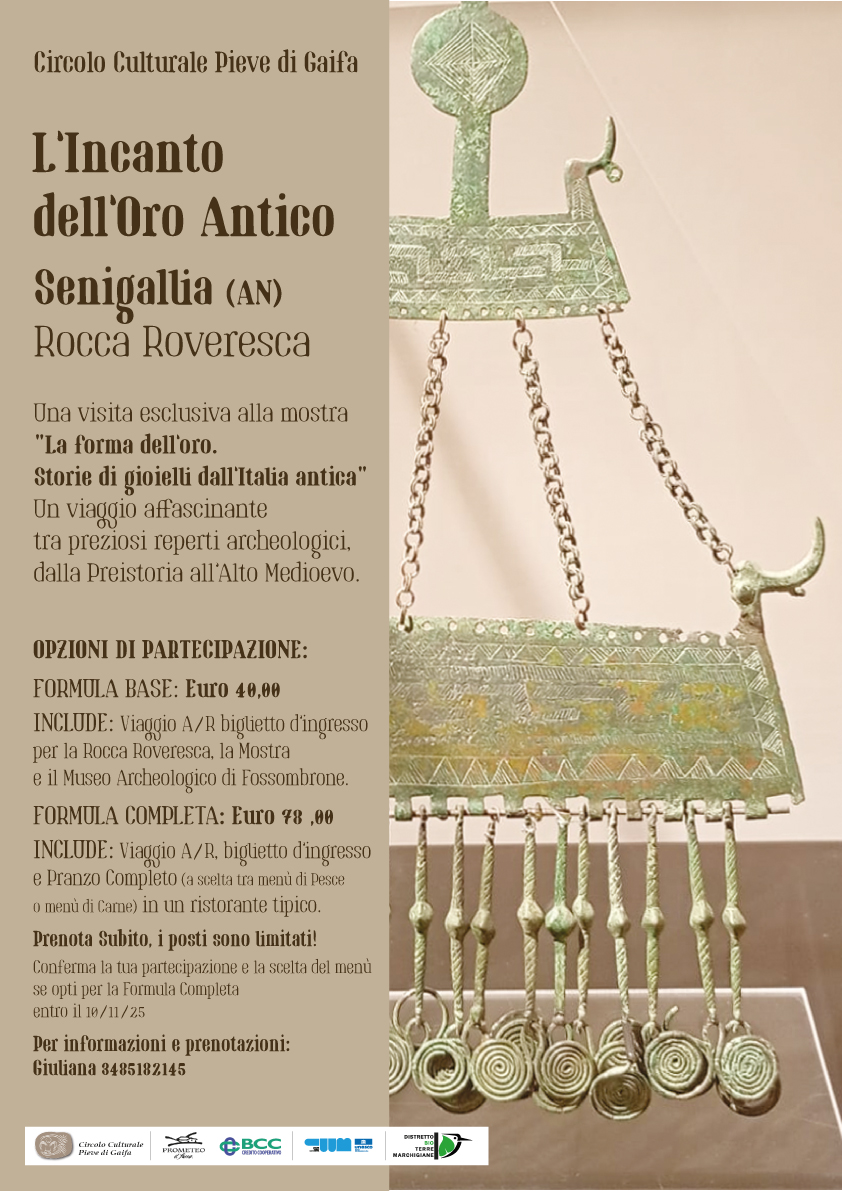 Non perdere l’occasione di immergerti nella storia e nella bellezza con una visita esclusiva alla mostra “La forma dell’oro. Storie di gioielli dall’Italia antica” presso la magnifica Rocca Roveresca di Senigallia (AN). Un viaggio affascinante tra preziosi reperti archeologici, dalla Preistoria all’Alto Medioevo, con in mostra il famoso pendaglio-pettorale piceno proveniente da Canavaccio.