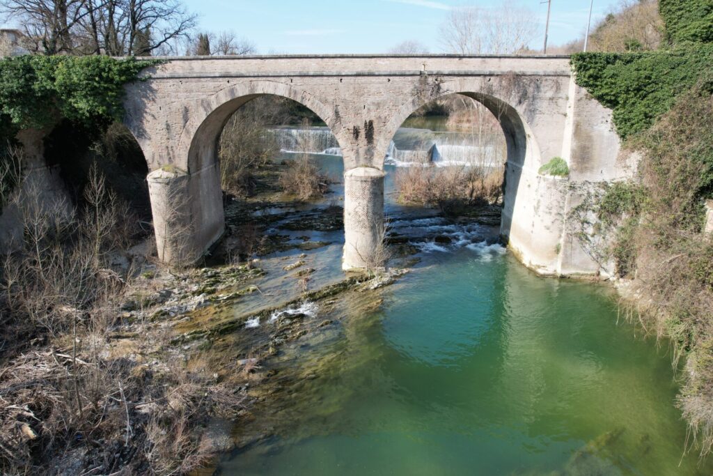 Poco a monte del mulino c’è il ponte delle piangole di origine Romana abbattuto durante il secondo conflitto mondiale e ricostruito come lo si vede oggi.
